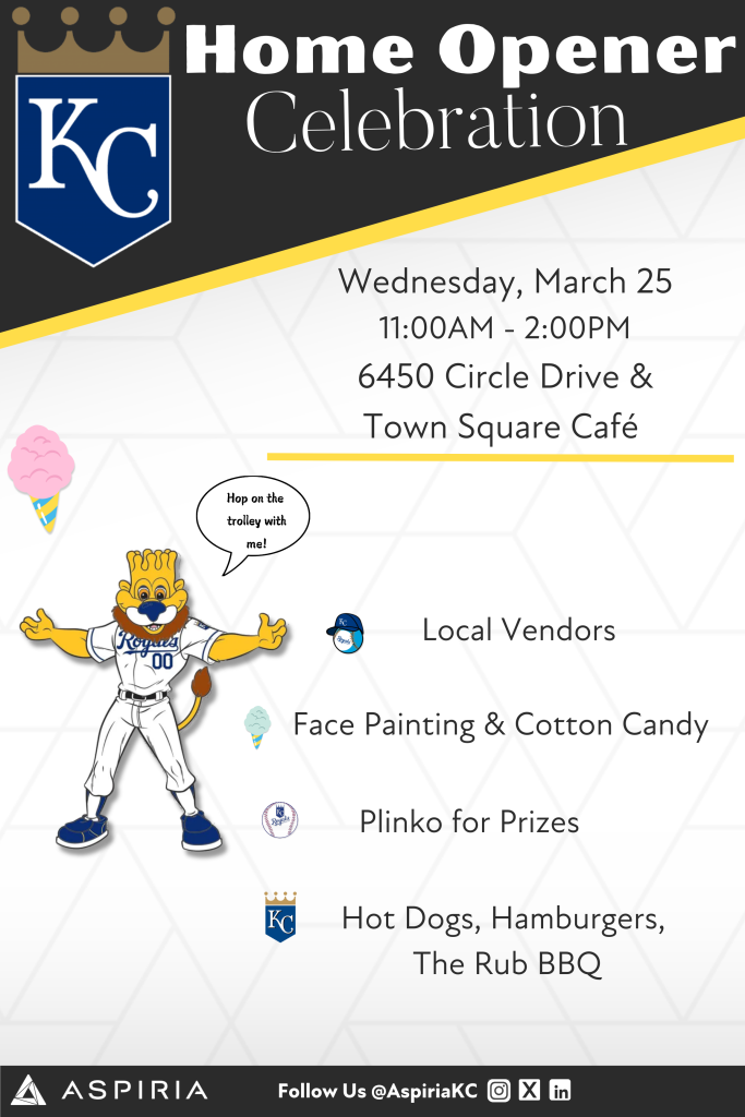 Join us for the Aspiria Home Opener Celebration as we celebrate the start of the KC Royals season on Wednesday, March 25th, from 11 AM–2 PM at 6450 Circle Drive & Town Square Café!